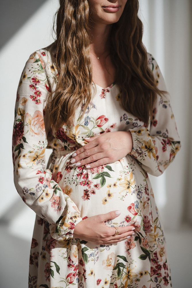 Model je vybavený elastickým pásom pod prsiami, ktorý sa jemne prispôsobí rastúcemu brušku a po pôrode krásne sedí na postave. Dlhé, mierne rozšírené bufetové rukávy dodávajú elegantný nádych, zatiaľ čo trendová potlač zvýrazňuje ľahký a moderný charakter.