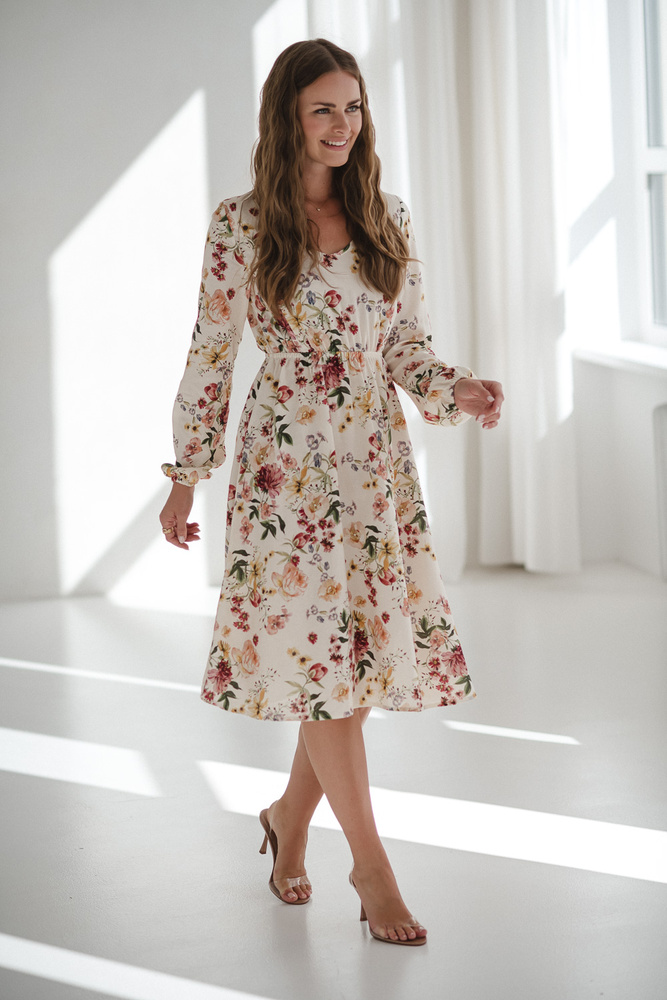 Krásne šaty Midi Milk&Love krémové kvetinové tehotenské a dojčiace šaty z ľanu, elegantný strih s dojčiacimi zipsami