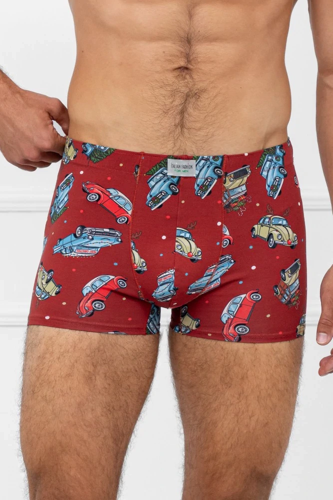 Moderný, na mieru šitý strih zvýrazňuje siluetu a neobmedzuje pohodlie. Netlačiaca guma v tuneli poskytuje stabilitu a zároveň nespôsobuje nepohodlie, čo ocení každý muž. Celok je doplnený značkovou nášivkou Italian Fashion, ktorá dodáva dizajnu elegantný a rafinovaný vzhľad. Najväčším lákadlom boxerov je však ich jedinečná vianočná tematika - autá vyzdobené vianočnými prvkami vytvárajú veselú a hrejivú atmosféru. Je to model, ktorý sa odlišuje od klasickej spodnej bielizne a na prvý pohľad vyvoláva úsmev.
