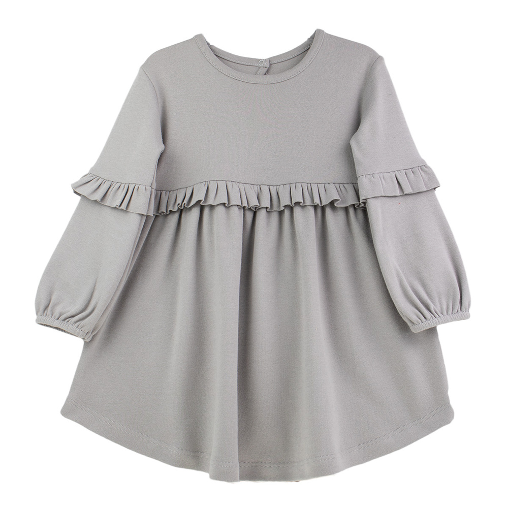 - Šedé dievčenské šaty s dlhými rukávmi Nicol, vyrobené zo 100 % certifikovanej bavlny. Zdobené volánikmi a vybavené praktickým zapínaním na slzu.