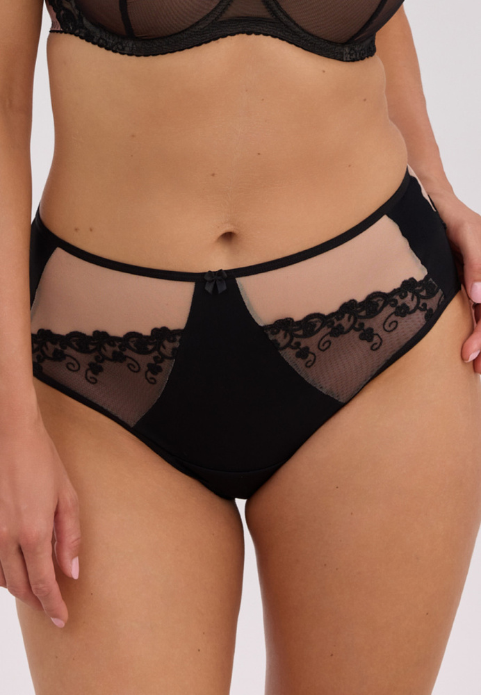 Starostlivo navrhnuté klasický dizajn s plným dnom krásne sa prispôsobí postave, zvýrazní prirodzené krivky a zároveň poskytuje pocit bezpečia a pohodlia. Kombinácia farieb moka a čiernej robí model výnimočne štýlovým a dokonale sa hodí k podprsenke Gaia Fatma, vytvorenie ucelenej a elegantnej súpravy spodnej bielizne.
