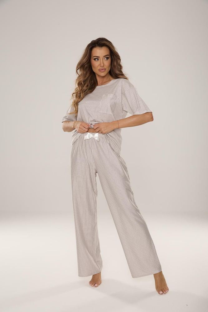 Súprava obsahuje dlhé nohavice, ktoré sú ideálne na chladnejšie noci a rána. Ozdobná mašľa v páse zdôrazňuje ženský charakter pyžama, pričom nemá vplyv na pohodlie nositeľa. Prírodná bavlna umožňuje pokožke dýchať a zabraňuje prehriatiu, čím výrazne zlepšuje kvalitu spánku.
