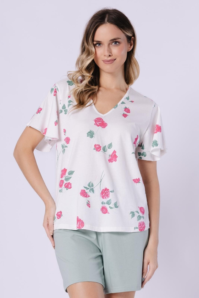 Vivian Leveza dámske bavlnené pyžamo 1725 krémové - ľahké pyžamo na leto, motýlie tričko + krátke šortky