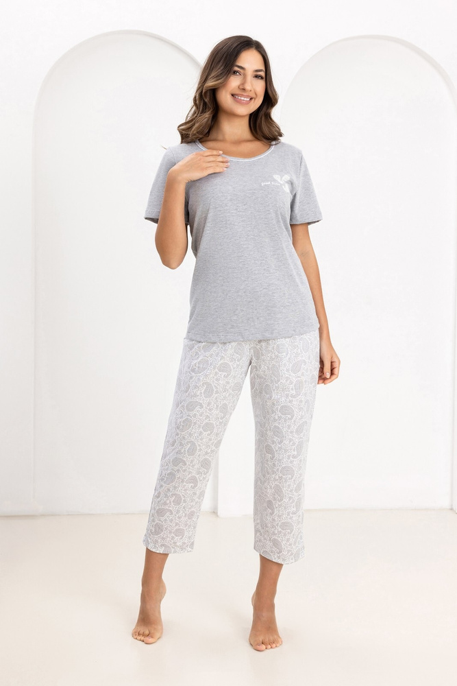 Súprava pozostáva z tričká s krátkym rukávom a vzorované nohavice s dĺžkou 7/8. Tričko s polkruhový výstrih dobre sedí na krku a nespôsobuje nepohodlie, a ozdobná potlač na prednej strane dodáva celkovému vzhľadu jemný, ženský nádych. Nohavice majú elastická páska s bavlneným lemom, aby sa prispôsobili postave bez tlaku - aj počas spánku.