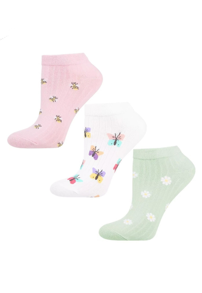 Jemné, ženské vzory dodávajú nohám jemný nádych. K dispozícii sú tieto farebné varianty: ružová s motívom včely, biela s motýľom alebo zelená s harmančekom - dizajn sa vyberá náhodne. Je to praktická voľba pre ženy, ktoré oceňujú pohodlie, prírodné tkaniny a jemné detaily, ktoré spríjemňujú každodenný štýl.