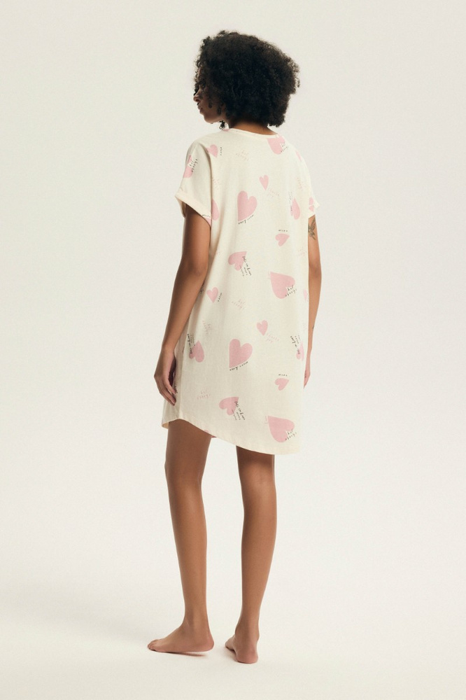 Krátke rukávy a polkruhový výstrih mu dodávajú jemnú eleganciu, ktorá je ideálna na každé ročné obdobie. Okrem toho je na prednej strane košele jemný nápis, ktorý jej dodáva jedinečný charakter. Vďaka uvoľnenému strihu je nočná košeľa mimoriadne pohodlná a neobmedzujúca, takže je ideálna na spanie aj každodennú relaxáciu doma. Jeho dĺžka po kolená zaručuje pohodlie bez obáv z príliš podporných materiálov.