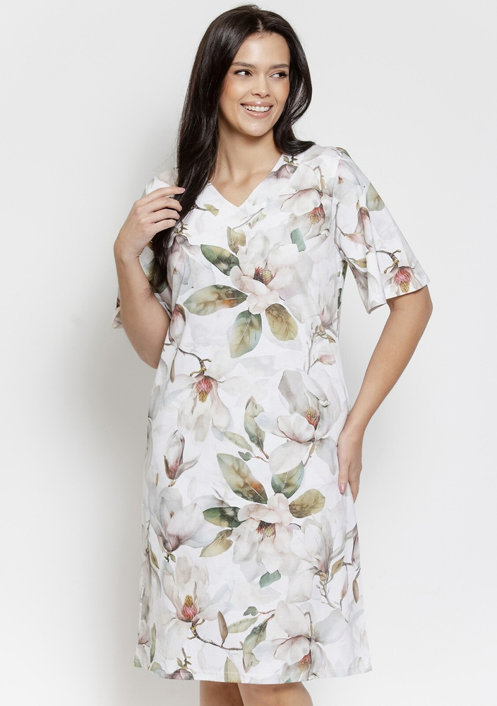 Košeľa je ušitá zo 100 % kvalitnej bavlny, ktorá je mäkká na dotyk, priedušná a šetrná aj k citlivej pokožke. Výstrih do V pôsobí ľahko a opticky predlžuje siluetu, krátky rukáv zvyšuje komfort počas teplých nocí. Dĺžka po kolená spolu s malými rázporkami v dolnej časti zlepšujú voľnosť pohybu pri spánku aj pri chôdzi doma. Rastlinný vzor v odtieni magnólie dodáva košeli pokojný, prirodzený a elegantný charakter.