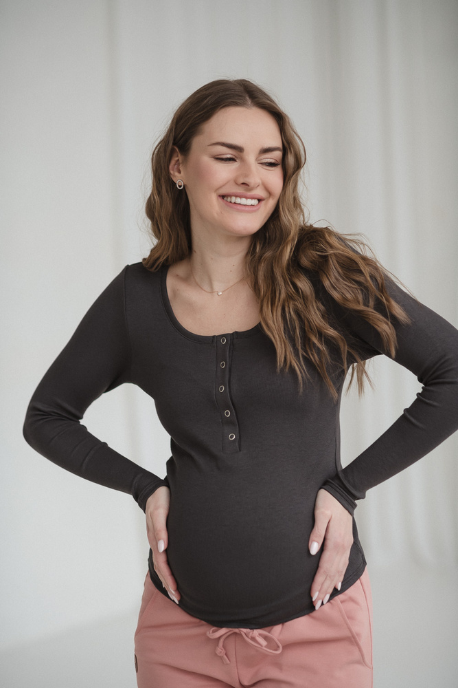 Priliehavý strih zvýrazňuje siluetu, zatiaľ čo strieborné patentky pri výstrihu umožňujú rýchle a diskrétne dojčenie doma aj mimo domova. Zároveň slúžia ako jemný ozdobný prvok. Blúzku môžete kombinovať s tehotenskými džínsami, legínami alebo elegantnými nohavicami – hodí sa na bežný deň aj na formálnejšiu príležitosť.