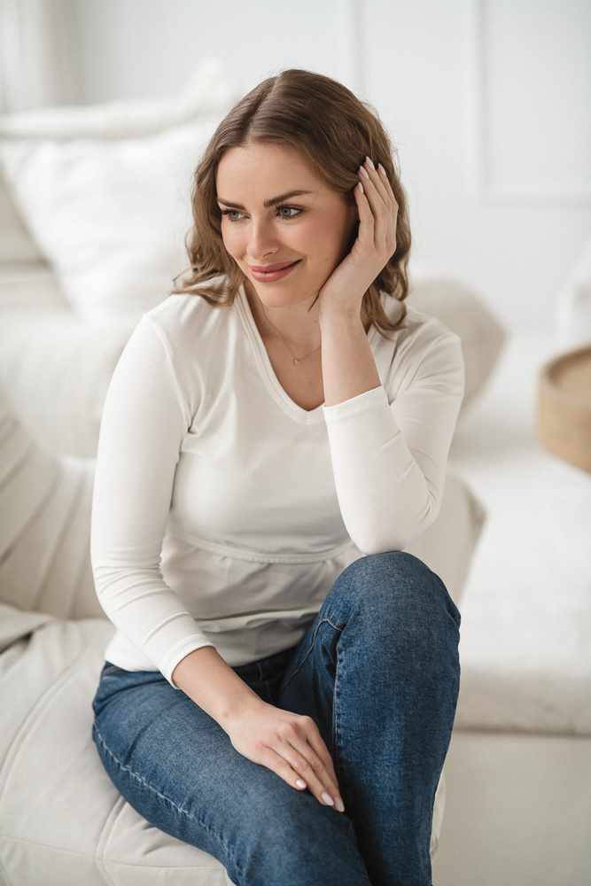Špeciálne riešenie typu „pútko“ umožňuje rýchle a diskrétne dojčenie bez nutnosti vyzliekania celej blúzky. Predĺžený strih zabezpečuje, že chrbát zostane zakrytý aj pri predklone alebo nosení bábätka. Rukáv 7/8 je ideálny na prechodné obdobia a do vykurovaných interiérov.