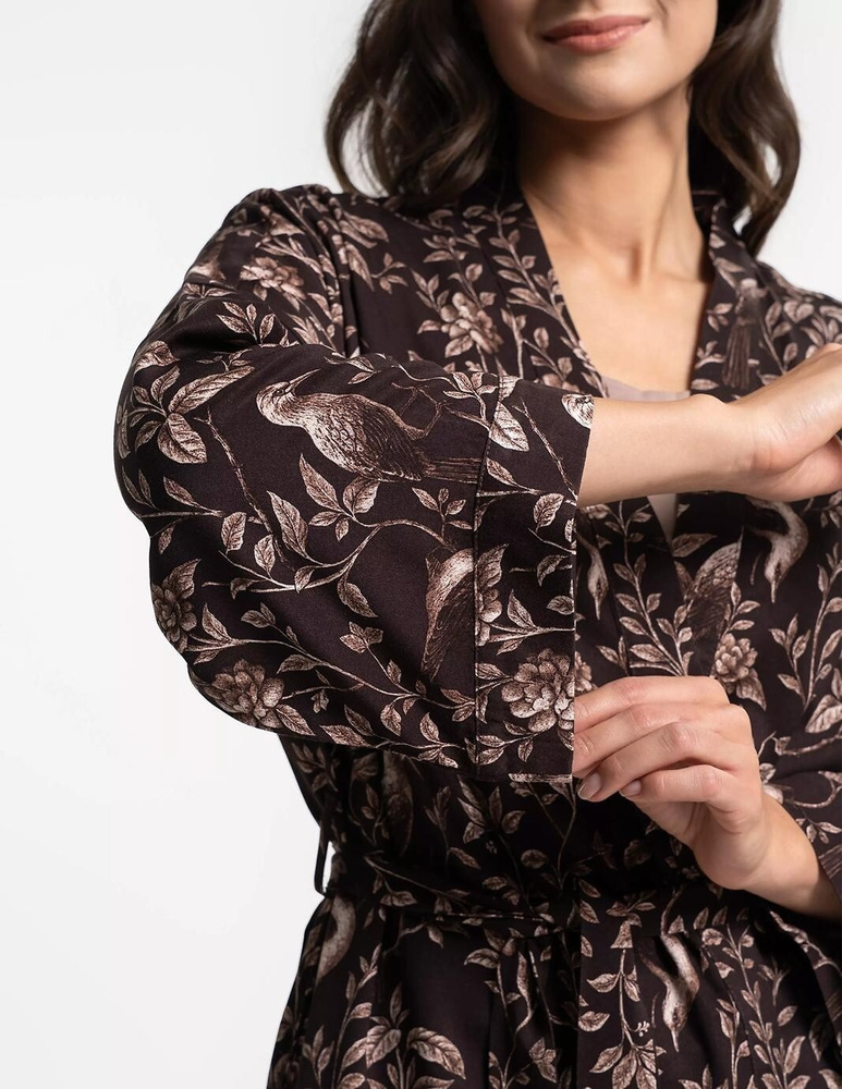 Župan je vyrobený zo 100 % viskózy, ktorá je známa svojou jemnosťou, hladkým povrchom a prirodzenou splývavosťou. Materiál sa prispôsobí postave bez toho, aby pôsobil ťažko. Opasok v páse umožňuje individuálne nastavenie obvodu, zatiaľ čo bočné vrecká zvyšujú praktickosť pri bežnom používaní. Jemný kvetinový vzor v odtieni cappuccino pôsobí žensky a elegantne.