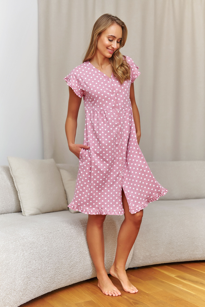 Nočná košeľa Doctor Nap 7303 je ideálnou voľbou pre budúce mamičky a dojčiace mamičky. Vyrobené z úpletu príjemného na dotyk (95 % bavlna, 5 % elastan) pre pružnosť a strih, ktorý sa prispôsobí meniacej sa postave. Obálkový výstrih pre rýchly a pohodlný prístup k prsníkom počas kŕmenia. Krátke rukávy a ženské lemy dodávajú celkovému vzhľadu jemný a elegantný nádych. Poľská výroba je zárukou kvality a zmyslu pre detail.