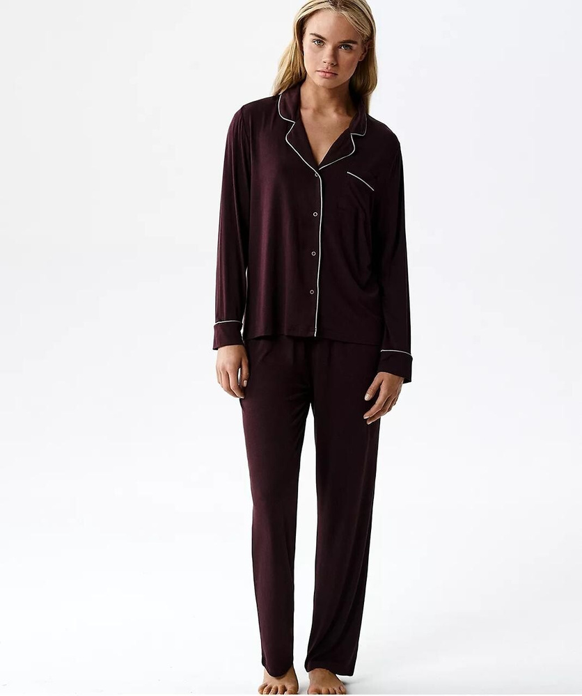 Hornú časť tvorí košeľový vrch s dlhým rukávom, golierom a zapínaním na gombíky, ktorý dodáva pyžamu elegantný a nadčasový vzhľad. Na hrudi sa nachádza malá našitá kapsička, ktorá jemne dopĺňa dizajn. Vďaka tomuto detailu pôsobí pyžamo štýlovo nielen v spálni, ale aj počas pokojného rána alebo večerného relaxu doma.