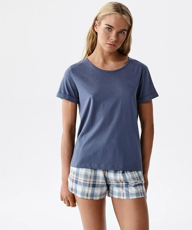 Vrchný diel tvorí tričko s krátkym rukávom a okrúhlym výstrihom, ktorý prirodzene sedí na postave a neobmedzuje pohyb. Prednú časť zdobí jemný nápis, ktorý dodáva pyžamu moderný a uvoľnený vzhľad. Spodný diel tvoria vzorované kraťasy s praktickými vreckami na bokoch, ktoré zvyšujú pohodlie pri nosení. Elastický pás sa prispôsobí postave a poskytuje príjemné nosenie bez tlaku.