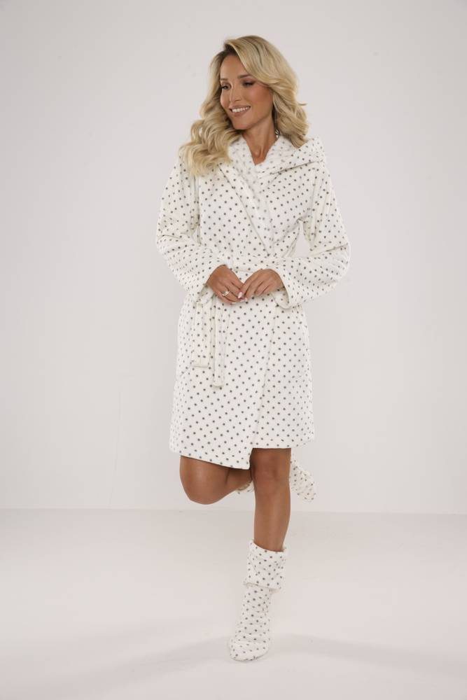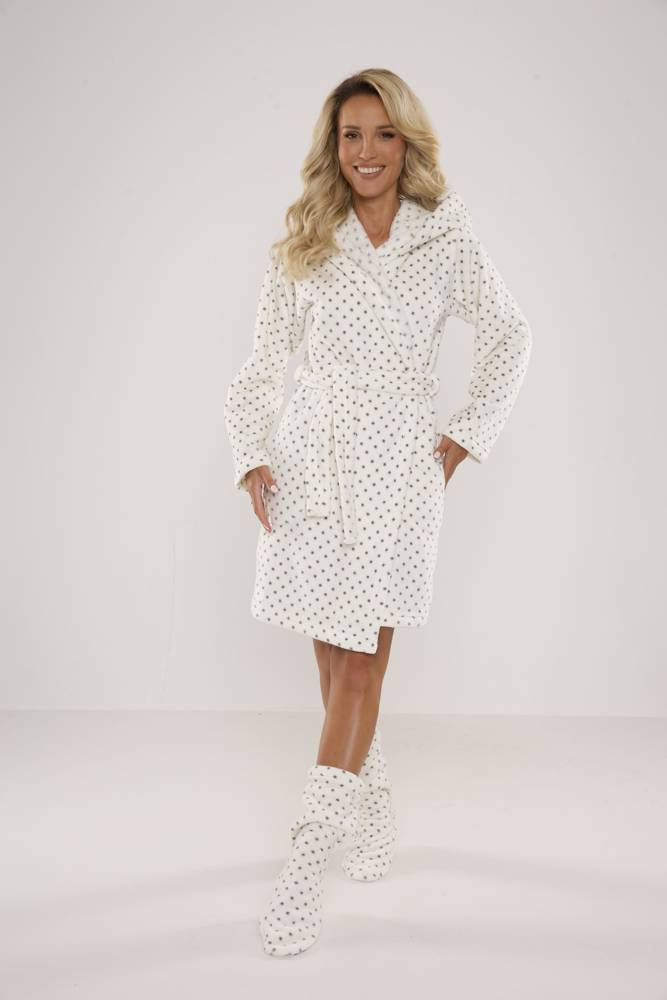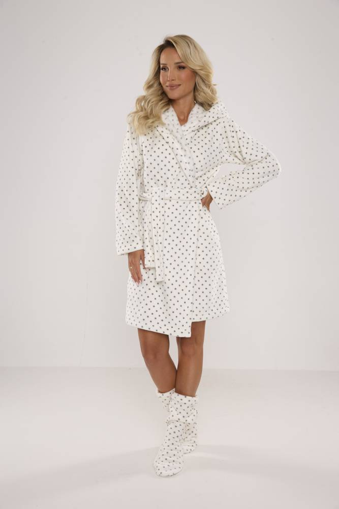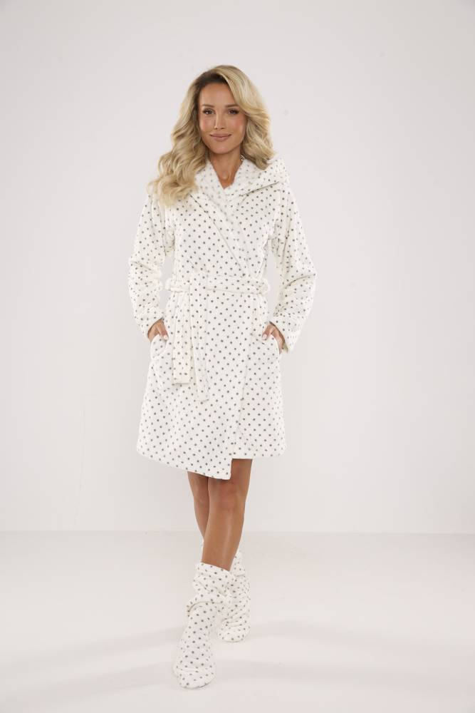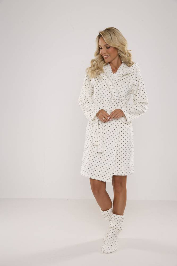 Dámsky župan FOREX rovného strihu s kapucňou. Dĺžka po kolená, bočné vrecká, pás so zaväzovaním na opasok. Všetko v hrášku. Župan sa dokonale prispôsobí tvaru tela, je mimoriadne mäkký a ľahký, vyrobený z jemnej pleteniny. Zabaliť sa do nej po kúpaní je pôžitok!