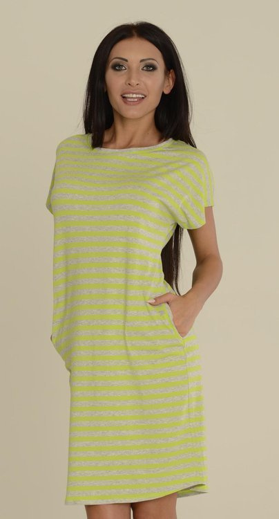 Dámske pruhované tričko s krátkym rukávom a vreckami. Lodičkový výstrih, dĺžka po kolená. Viskóza je materiál, ktorý sa dokonale prispôsobí telu, ale zároveň je priedušný a šetrný k pokožke. Viskózové vlákna, ktoré zaručujú dobré tvarovanie, sú priedušné a príjemné na dotyk. Hovorí sa, že spájajú estetické vlastnosti hodvábu s jednoduchou starostlivosťou bavlny. MATERIÁL SA PO VYPRANÍ NEZAFARBÍ ANI NEDEFORMUJE !!! KOŠEĽA JE VYROBENÁ V ELEGANTNOM ŠTÝLE A KAŽDÁ ŽENA SA V NEJ BUDE CÍTIŤ VÝNIMOČNE !!!