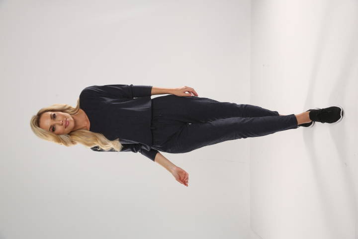 Dámsky overal s rukávmi s dĺžkou 7/8. Zaväzuje sa pri krku, s nápadným prestrihom v tvare slzy. Elastický pás na zvýraznenie postavy. Bedrové vrecká. Nohy mierne zúžené. Módny, voľný strih pre pohodlie a komfort počas aktívneho dňa.