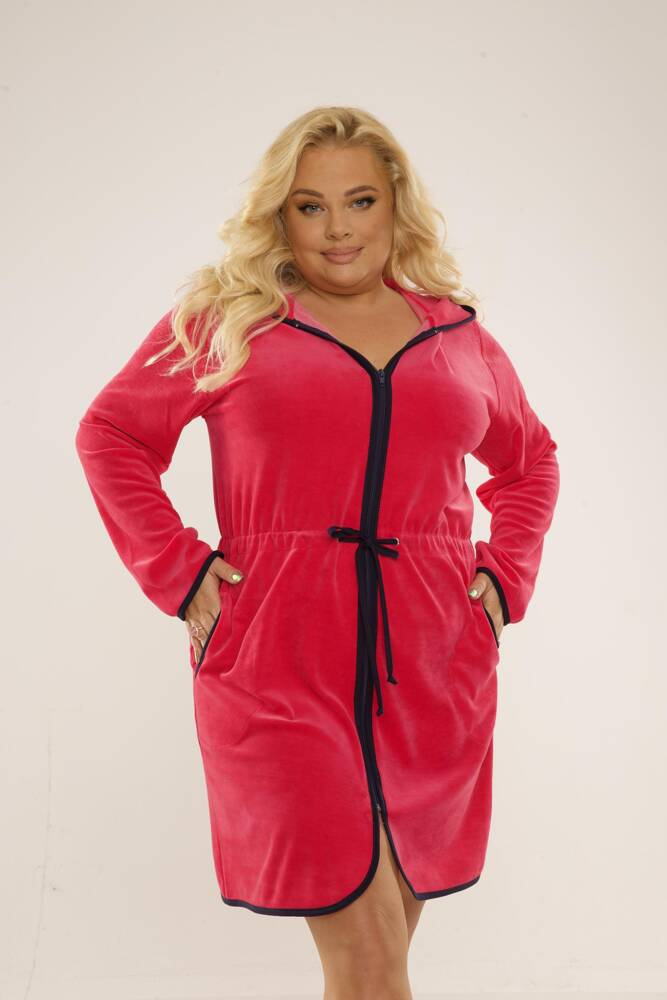 Dámsky krátky župan s kapucňou, zapínanie na zips. Vyrobené z velúru. Nastaviteľné popruhy v páse. Župan sa dokonale prispôsobí tvaru tela, je mimoriadne mäkký a ľahký. Zabaliť sa do nej po kúpaní je pôžitok!