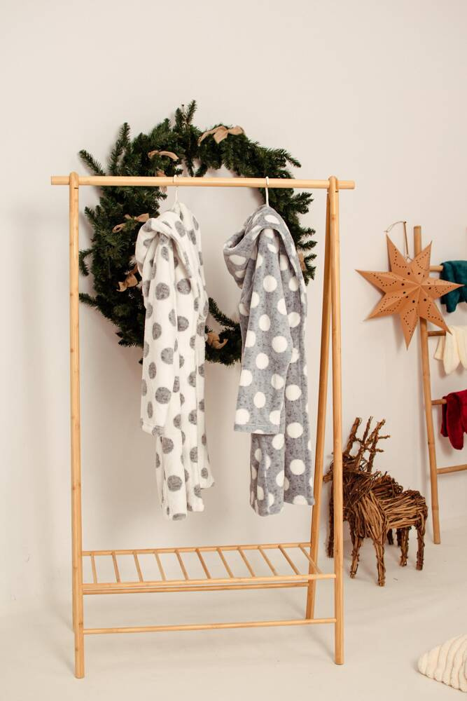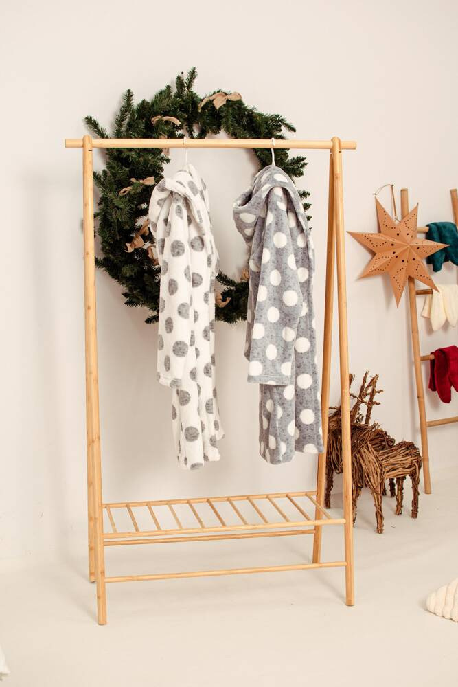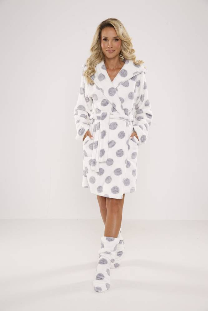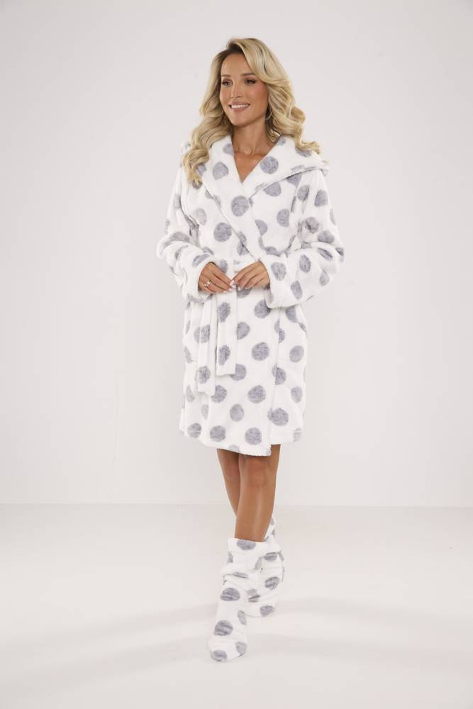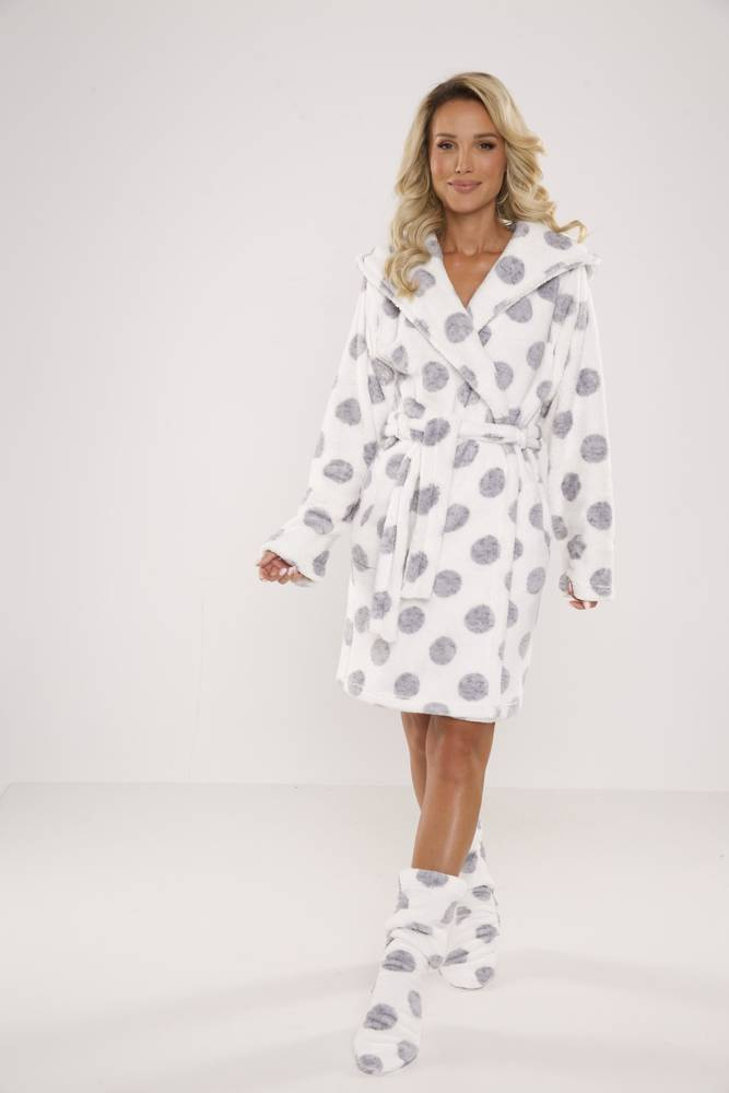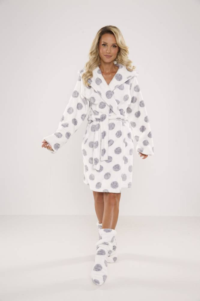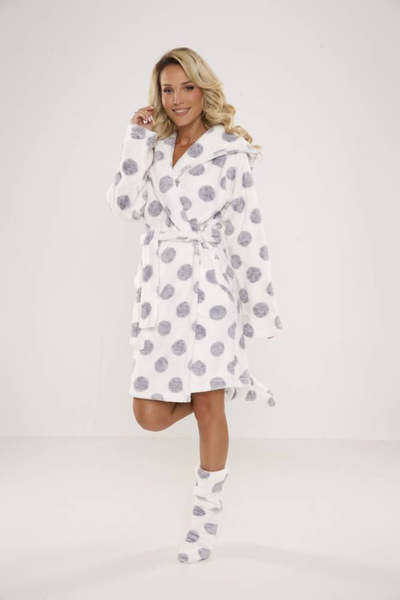 Dámsky krátky župan s kapucňou z mäkkej pleteniny s veľkými bodkami. Viazané v páse, s vreckami. Hlavnou výhodou tohto modelu je teplá a na dotyk príjemná plyšová tkanina. JE TO VYSOKO KVALITNÝ VÝROBOK S VEĽMI DOBROU ABSORPCIOU VODY !!!