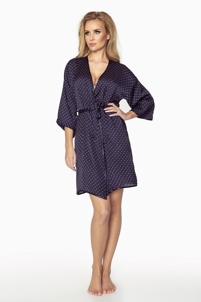 Dámsky krátky župan viazaný v páse. Vyrobené z bodkovaného saténu. Model pre teplé letné dni alebo horúce zimné noci. Jemne obopína ženskú postavu pre maximálne pohodlie a voľnosť. Zakrýva telo len do výšky stehien. Mattkanina sa po praní nezafarbí ani nedeformuje. Župan je zabalený v krásnej dvojdielnej krabici, takže ak hľadáte niečo, čo by ste mohli darovať svojej polovičke, je to pre vás ideálna voľba.