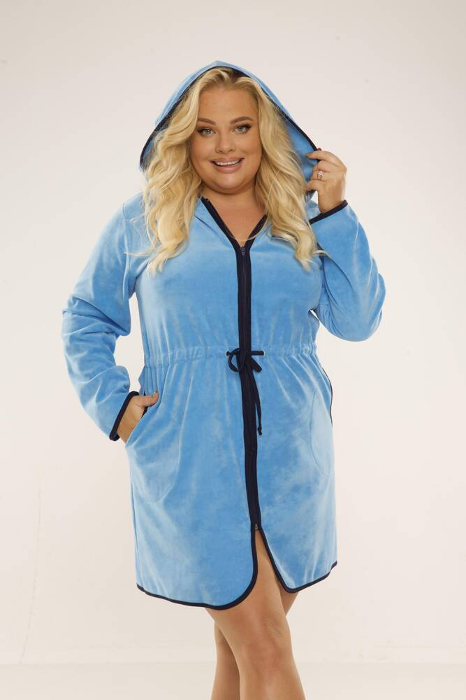 Dámsky krátky župan s kapucňou, zapínanie na zips. Vyrobené z velúru. Nastaviteľné popruhy v páse. Župan sa dokonale prispôsobí tvaru tela, je mimoriadne mäkký a ľahký. Zabaliť sa do nej po kúpaní je pôžitok!
