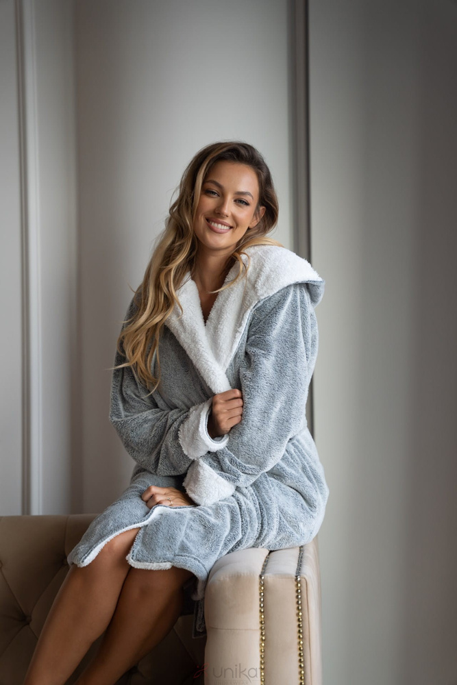 Szlafrok charakteryzuje się klasycznym fasonem z kieszeniami i kapturem oraz przewiązującym paskiem, co jest bardzo praktyczne oraz schludnie prezentuje się na każdej sylwetce. Wygodny krój zapewni maksymalną swobodę ruchów.