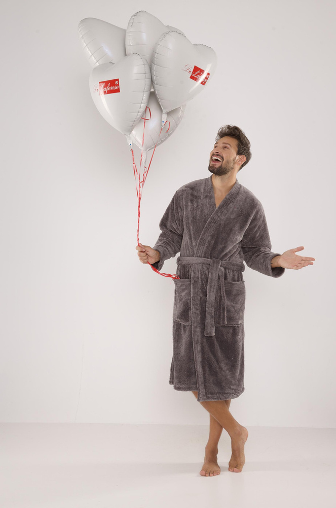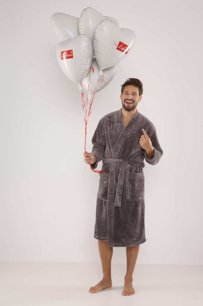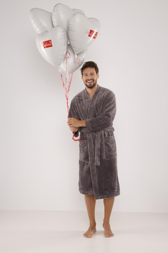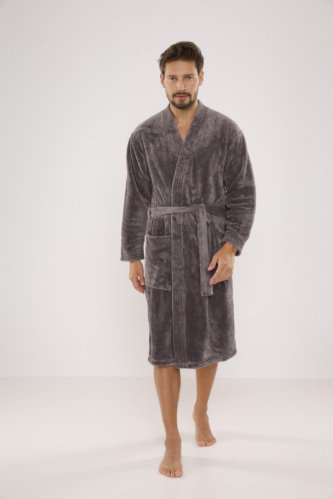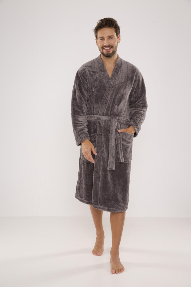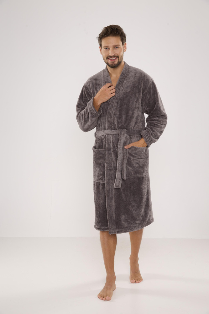 Pánsky dlhý župan z mäkkej pleteniny. Viazanie v páse, vonkajšie vrecká na bokoch, našitá aplikácia na úrovni hrudníka. Príjemné a príjemné na dotyk, zaručuje pohodlie pri nosení. Hlavnou výhodou tohto modelu je hrejivá a na dotyk príjemná plyšová tkanina, ktorá dokonale absorbuje vodu.