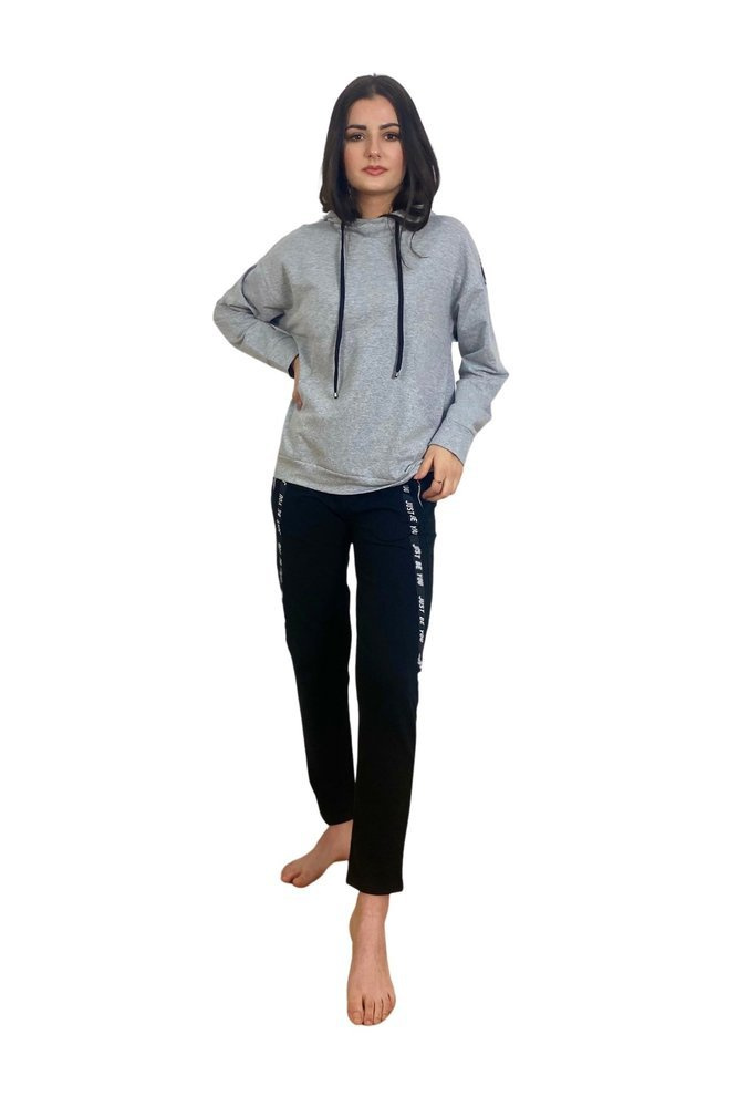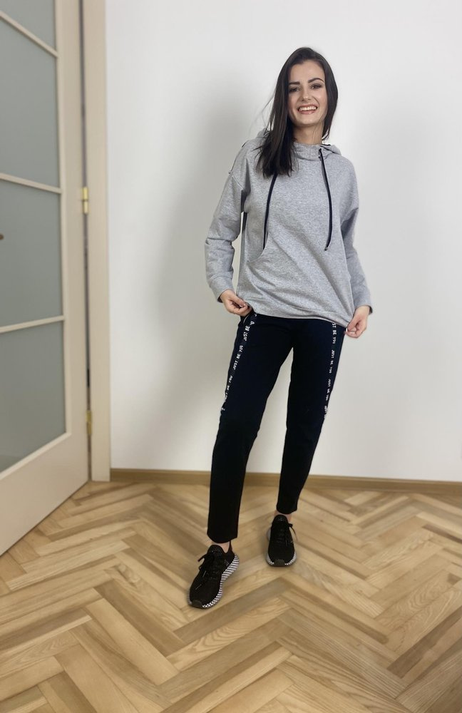Pohodlná dámska tepláková súprava z materiálu príjemného na telo. Mikina s dlhým rukávom a kapucňou. Na úrovni brucha, vrecko. Nohavice s vreckami. Opasok zakončený šnúrkou. Rukávy a nohy zdobené nápisom.