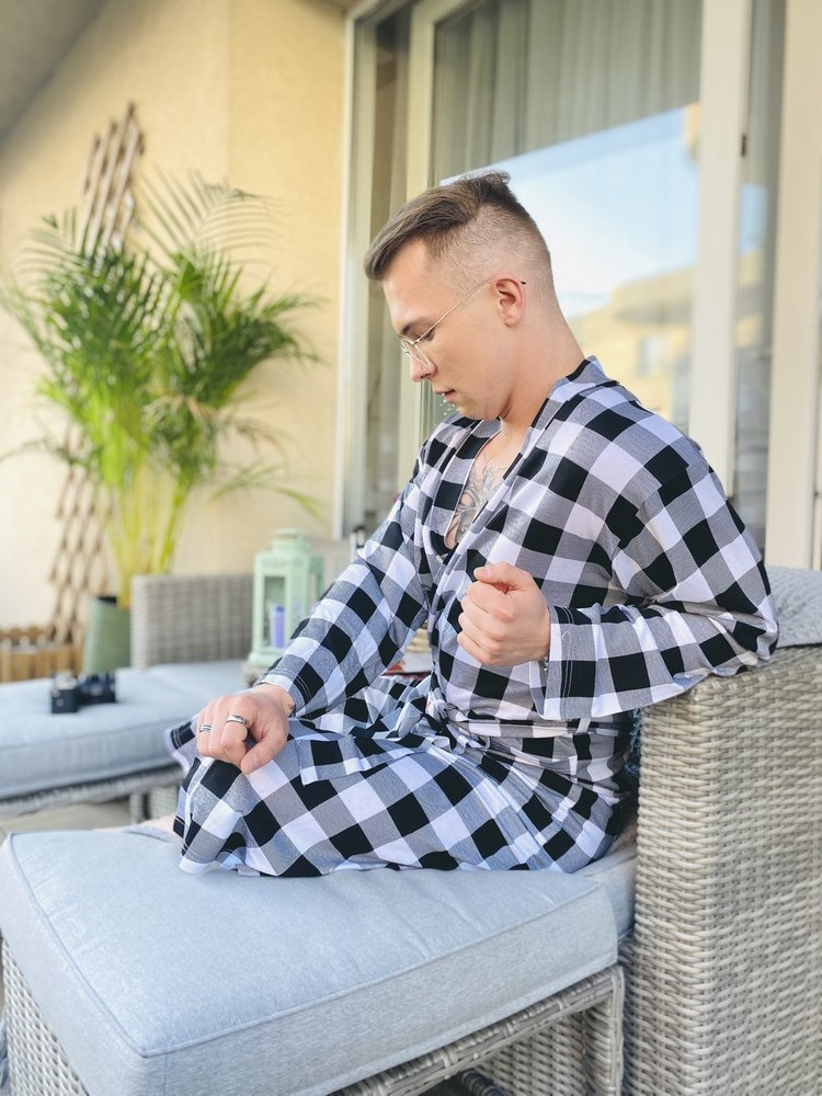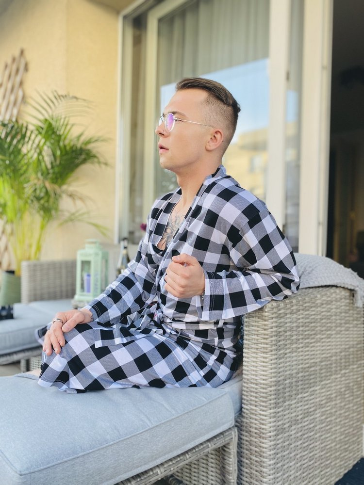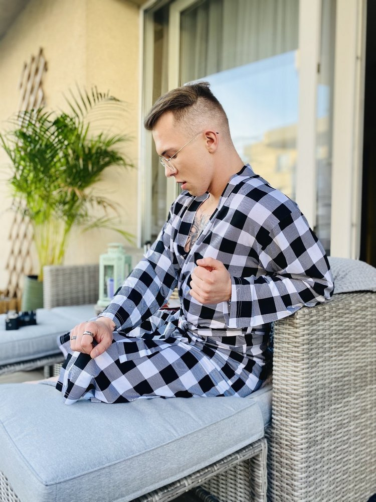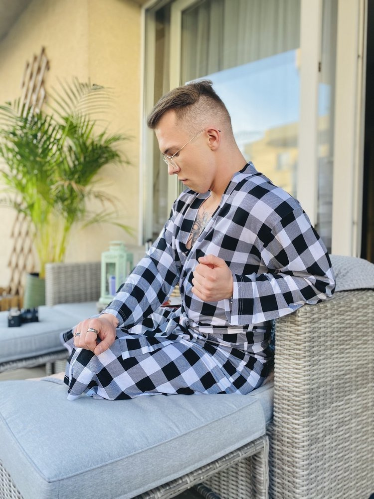 Tenký a na dotyk príjemný župan z mäkkej viskózy. Župan je zaviazaný v páse, má dve bočné vrecká a golier. Všetko v károvaná, čo jej dodáva zvláštne čaro. Model odolný voči mashing a poskytuje vynikajúcu ochranu pred chladom.