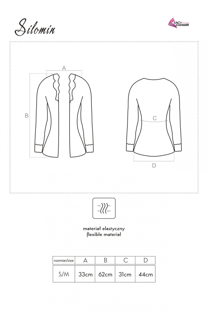 Fascinujúca súprava spodnej bielizne z jemnej čiernej čipky. Krátky župan a body s nastaviteľnými ramienkami. Vrchný diel a dlhé rukávy županu zdobené čiernou čipkou. Podprsenka má vertikálne rozparky. Zadná časť je v spodnej časti zdobená čipkou, ktorá zvodným spôsobom odhaľuje chrbát.