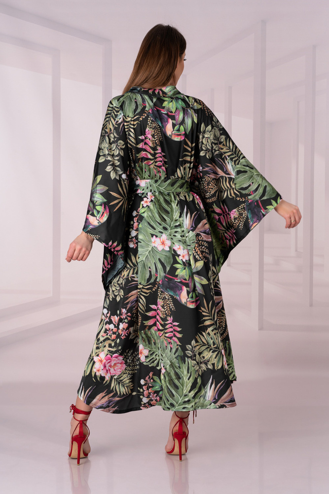 Kombinácia jemnej zmyselnosti so štýlovou originalitou. Župan, ktorý sa v páse zaväzuje na hrubú šerpu, je vyrobený zo vzdušnej tkaniny. Mäkký a na dotyk príjemný materiál. Čierna tkanina je zdobená originálnym vzorom zobrazujúcim kvetinové motívy. Okraje látky boli chránené pred žmolkovaním zložením a podšitím látky, čím vznikol elegantný povrch. Obálkový strih županu umožňuje ľahko upraviť hĺbku výstrihu. Pohodlné, široké rukávy neobmedzujú pohyb pre pohodlie a voľnosť pri používaní. Šaty vyzerajú perfektne na každom type postavy. Bol navrhnutý tak, aby zakryl nedokonalosti a odhalil prednosti postavy.