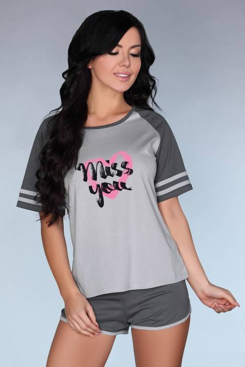 Veľmi pohodlné bavlnené pyžamo pozostávajúce z krátkych tmavosivých šortiek lemovaných svetlejším lemovaním na spodnej časti a tmavého trička s krátkym rukávom popolovej farby s lemovaním. Okrem toho má tričko čierny nápis na ružovom srdci.