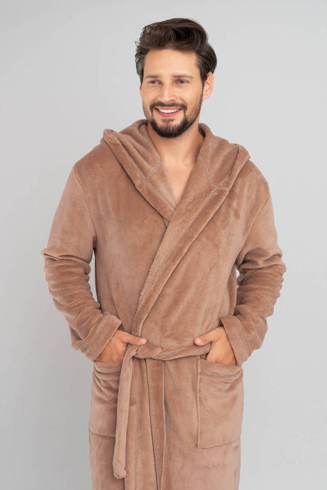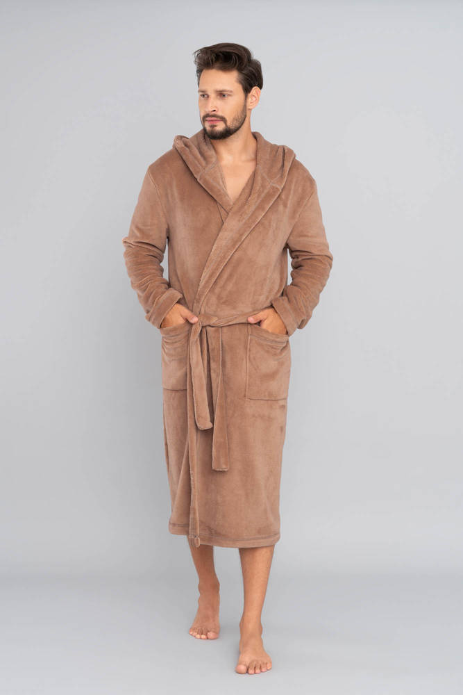 Dlhé pánsky župan s kapucňou, viazaný v páse.