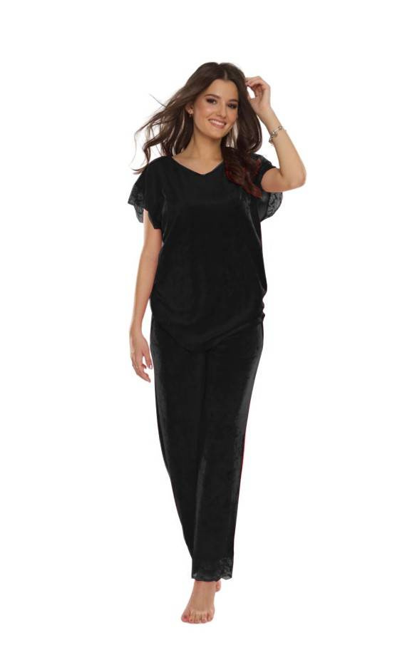 Dvojdielne pyžamo De lafense z kvalitného bambusu. Ideálne na dobrý spánok a skvelý štart do dňa pri prvej rannej káve. Voľná blúzka s krátkymi rukávmi, zdobená čipkou. Model nie obmedzuje pohybuje sa a pekne zvýrazňuje siluetu. Dlhé pevné nohavice s elastickým pásom. Pyžamo príjemné na dotyk v zaujímavých farbách.