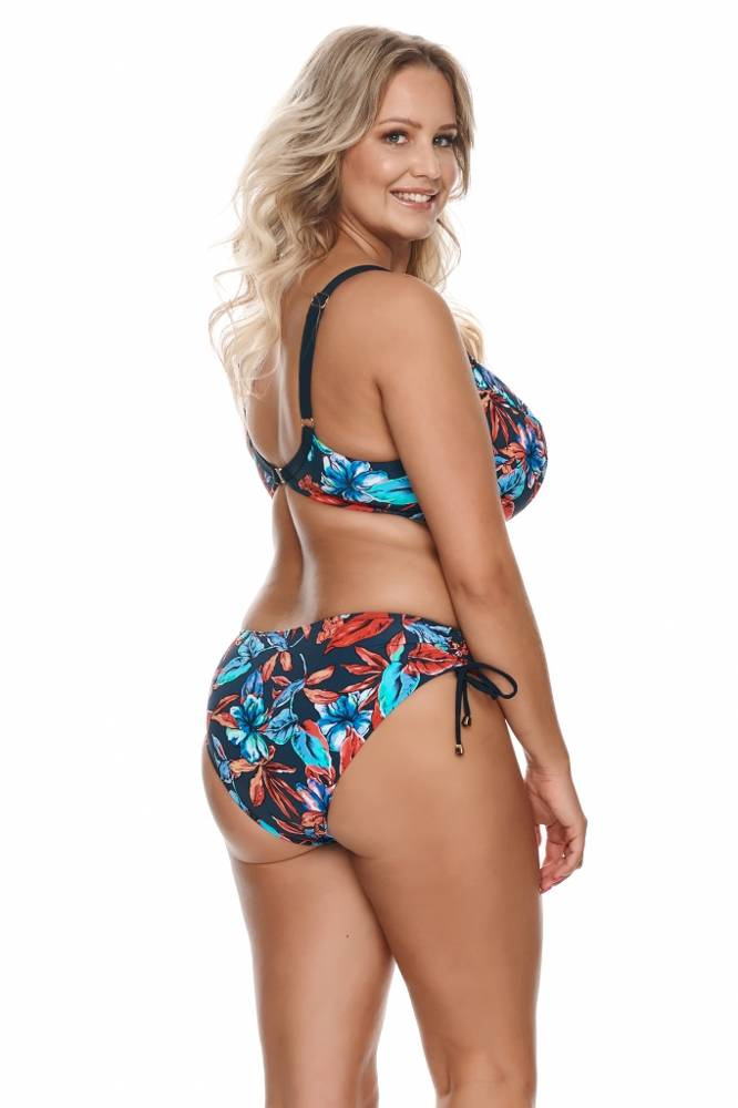 Plavky v krásnych, žiarivých farbách. Mäkká pletená podprsenka zdobená kvetinovým motívom. Vďaka modelujúcim strihom a kosticiam dokonale podopiera poprsie. Nastaviteľné, neodnímateľné ramenné popruhy. Šírka remienka a typ zapínania podľa veľkosti plaviek. Jemná dekorácia medzi šálkami dodáva celku šarm. Ideálne pre dámy s plnším tvarom.