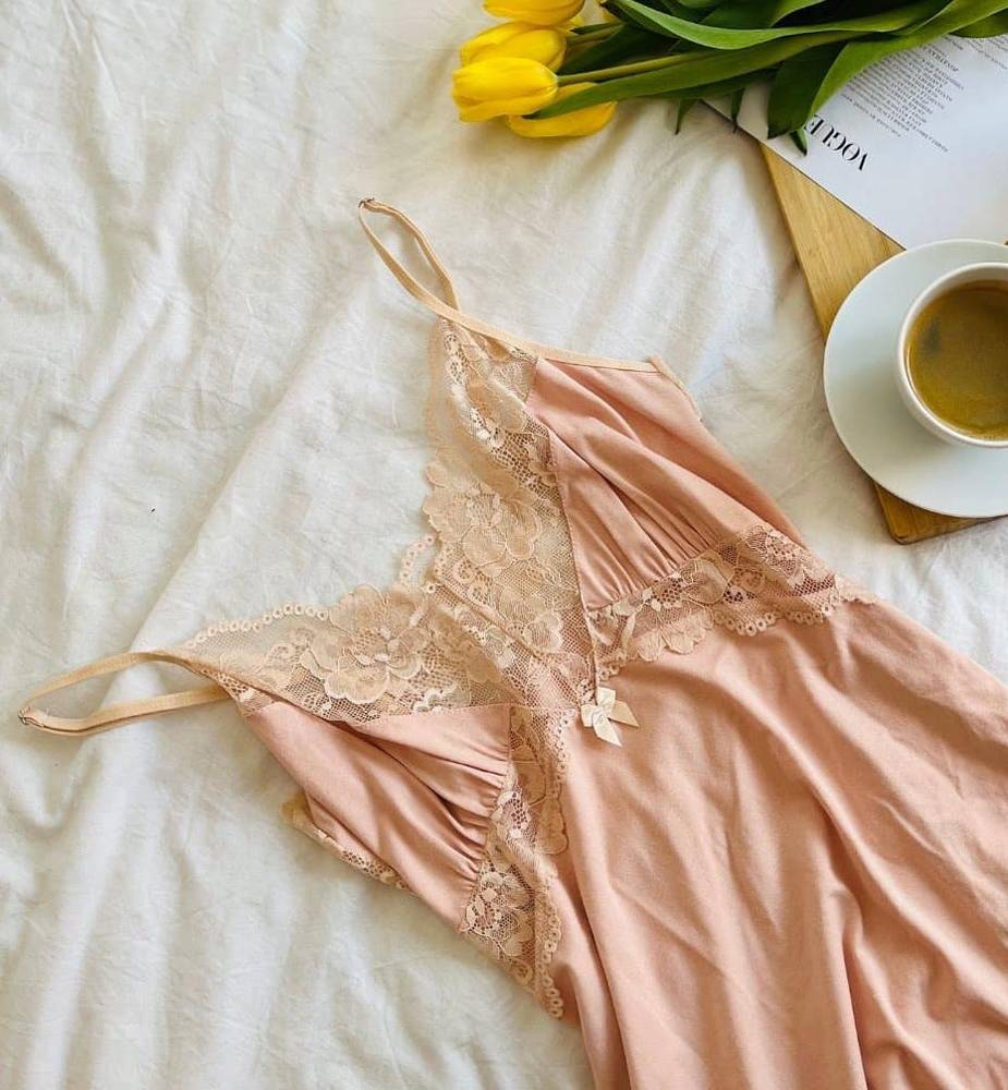 Dvojdielne pyžamo De lafense z vysoko kvalitnej viskózy. Ideálne na dobrý spánok a skvelý štart do dňa pri prvej rannej káve. Tričko s tenkými ramienkami, zdobené čipkou. Pevné šortky, krátke, typ šortiek.