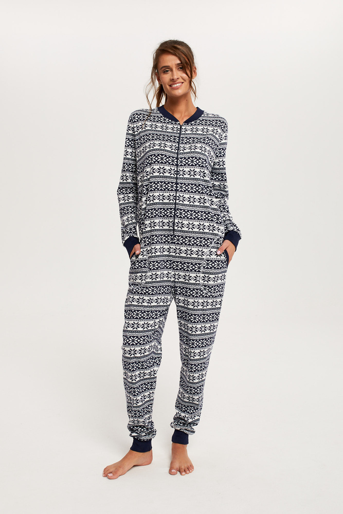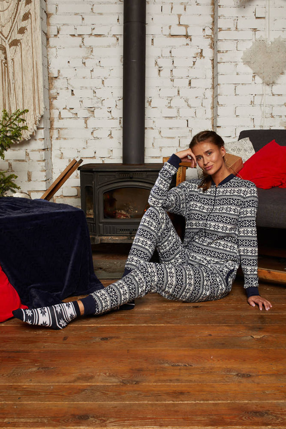 Neobvyklý dámsky overal s očarujúcou zvieracou potlačou je zaujímavým návrhom na nadchádzajúcu sezónu. Celá látka je ušitá zo 100 % bavlneného džerseja. Vyrábajú sa v dvoch farebných verziách: tmavočervenej a námorníckej modrej a sú posypané bielymi snehovými vločkami. Oblek sa zapína na zips, takže sa pohodlne používa a samotný výrobok je veľmi pohodlný a funkčný.