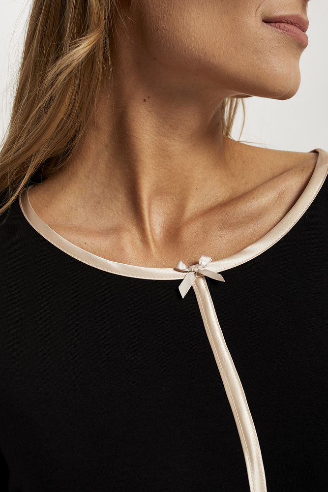 Dámske pyžamo s dlhými rukávmi a dlhými nohavicami. Pyžamo má okrúhly výstrih a kontrastné saténové lemovanie uprostred. Pri krku je blúzka zakončená pôvabnou mašľou. Kompletné dlhé nohavice zakončené gumou v spodnej časti. Vďaka použitiu viskózy obohatenej elastanom je toto pyžamo ideálne na chladnejšie večery.