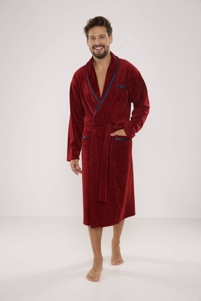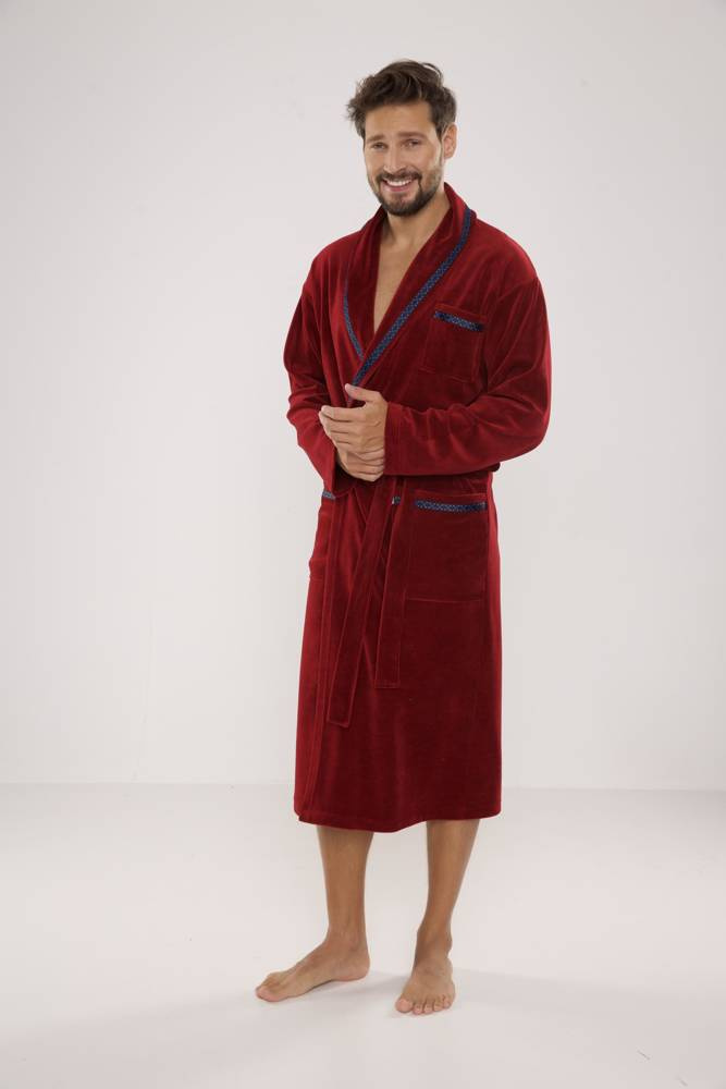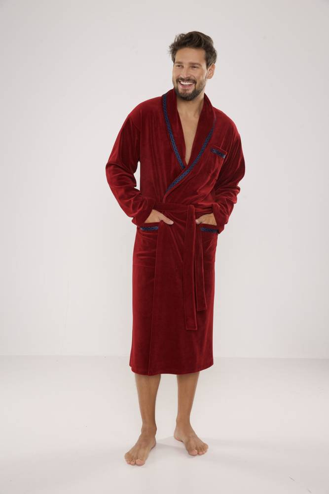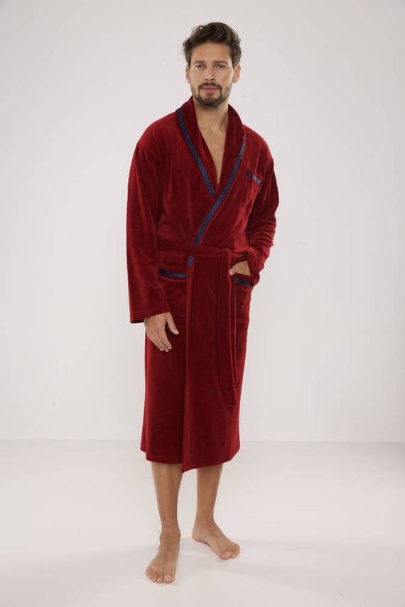 Pánsky dlhý velúrový župan. Model so šálovým golierom, uviazaný v páse, s dvoma vreckami na bokoch a jedným na hrudi. Wvyrobené z 80 % bavlneného velúru. Material príjemné s jemným pocitom a vynikajúcou absorpciou vody.