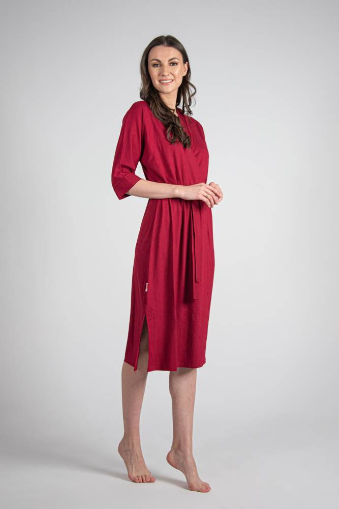 Dlhší strih modelu dokonale obopína telo, zatiaľ čo 3/4 rukávy a zaväzovanie v páse zvýrazňujú pás a dodávajú celkovému vzhľadu ľahkosť a ženskosť.