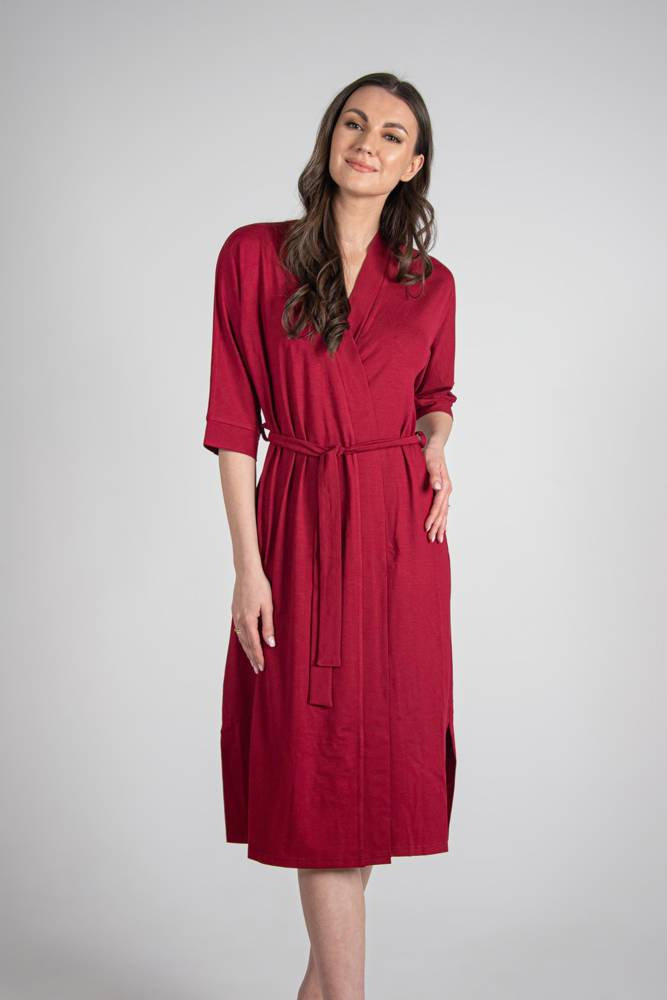 • Elegantný dámsky župan 942 Visa značky De Lafense z vysokokvalitnej viskózy. Dlhý strih, 3/4 rukáv a pás vytvárajú ženský a klasický vzhľad.
