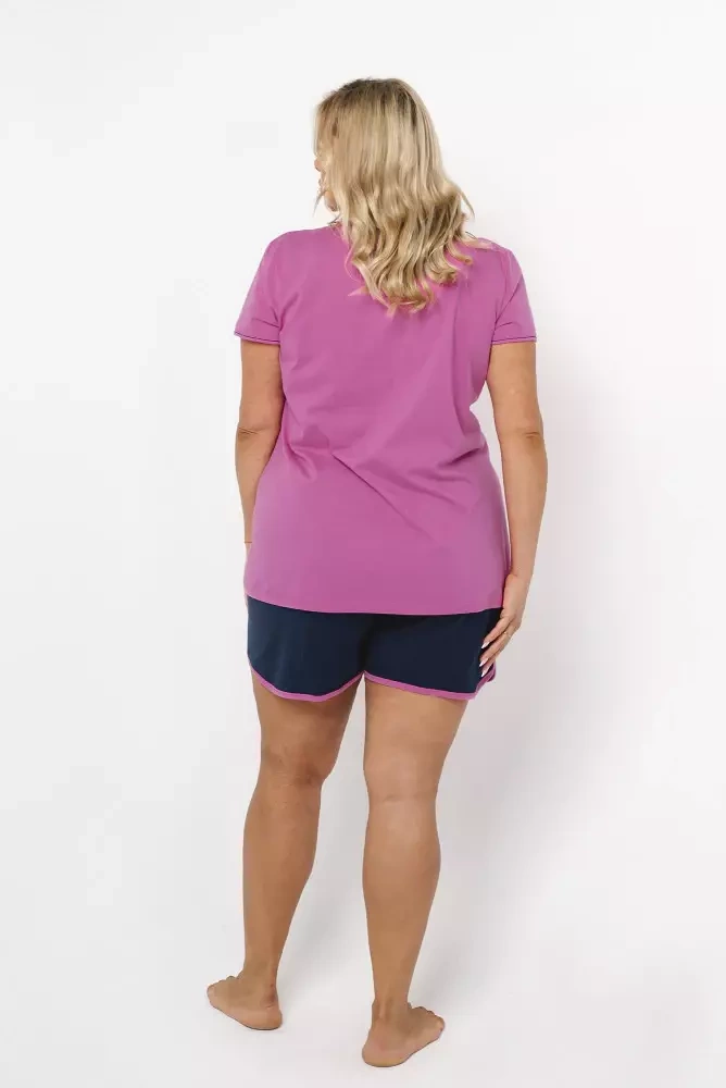 Športové dvojdielne dámske pyžamo s krásnou kombináciou ružovej a tmavomodrej farby. Vyrobené z najkvalitnejšej 100% bavlnenej pleteniny od najlepších dodávateľov. Klasický strih pyžama, okrúhly výstrih a elastický pás, ktorý netlačí, zaručujú pohodlie pri používaní. Šortky majú vrecká a sú zakončené kontrastným lemovaním vo farbe mikiny.