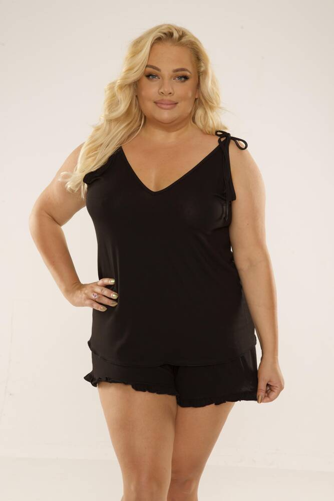 Dvojdielne pyžamo De lafense z vysoko kvalitnej viskózy. Ideálne na dobrý spánok a skvelý štart do dňa pri prvej rannej káve. Tričko s úzkymi ramienkami a ozdobným zaväzovaním na ramenách. Výstrih v tvare písmena V a chrbát. Krátke šortky - nohavice zakončené volánom.