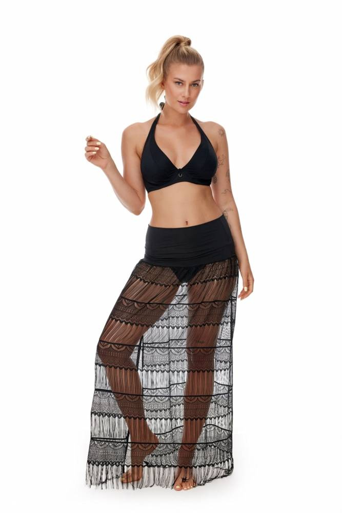 Čierne plážové pareo v podobe tuniky v boho štýle. Elastický top s výstrihom typu bandeau. Časť sukne z priehľadnej čipky s koketným výrezom a zakončená strapcami. Dá sa nosiť dvoma spôsobmi, ako šaty alebo ako sukňa. Ideálne na pláž a ako doplnok k letnému oblečeniu.